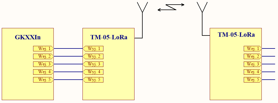 Moduły te można łączyć w różnych konfiguracjach. Mogą tworzyć radiowe łącze sygnałowe złożone z dwóch modułów TM-05-LoRa. Tak utworzone dwukierunkowe łącze umożliwia przesyłanie sygnałów w obu kierunkach, 5 sygnałów dwustanowych oraz 2 sygnałów analogowych. To rozwiązanie może być zastosowane z systemem GOLEM ale nie jest optymalne.