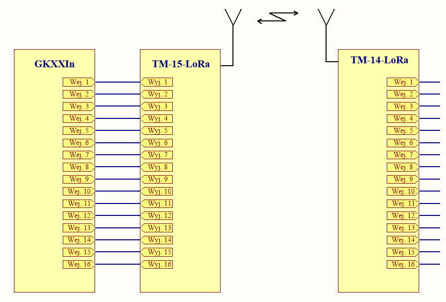Lepszym rozwiązaniem jest zastosowanie modułu 16 wyjść TM-15-LoRa oraz modułu 16 wejść TM-14-LoRa. Taka konfiguracja tworzy jednokierunkowe łącze sygnałowe umożliwiające przesłanie 16 sygnałów dwustanowych. Jest to rozwiązanie, które może łączyć odległe punkty (np. inne hale) gdzie po stronie modułu wejść, maszyny nie są bardzo rozproszone.