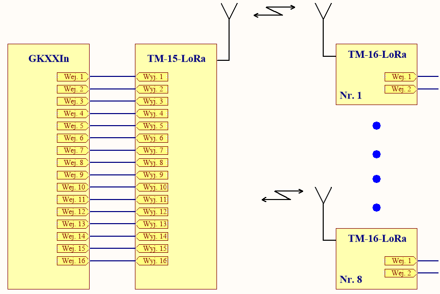 Gdy jednak mamy do czynienia z bardziej rozproszonymi punktami zbierania danych a każda z nich posiada jedno lub dwa wejścia do odczytu to można zastosować rozwiązanie radiowe łącze rozproszonych wejść. Pozwala ono podłączyć do pojedynczego modułu wyjść TM-15-LoRa wielu modułów wejściowych TM-16-Lora.
